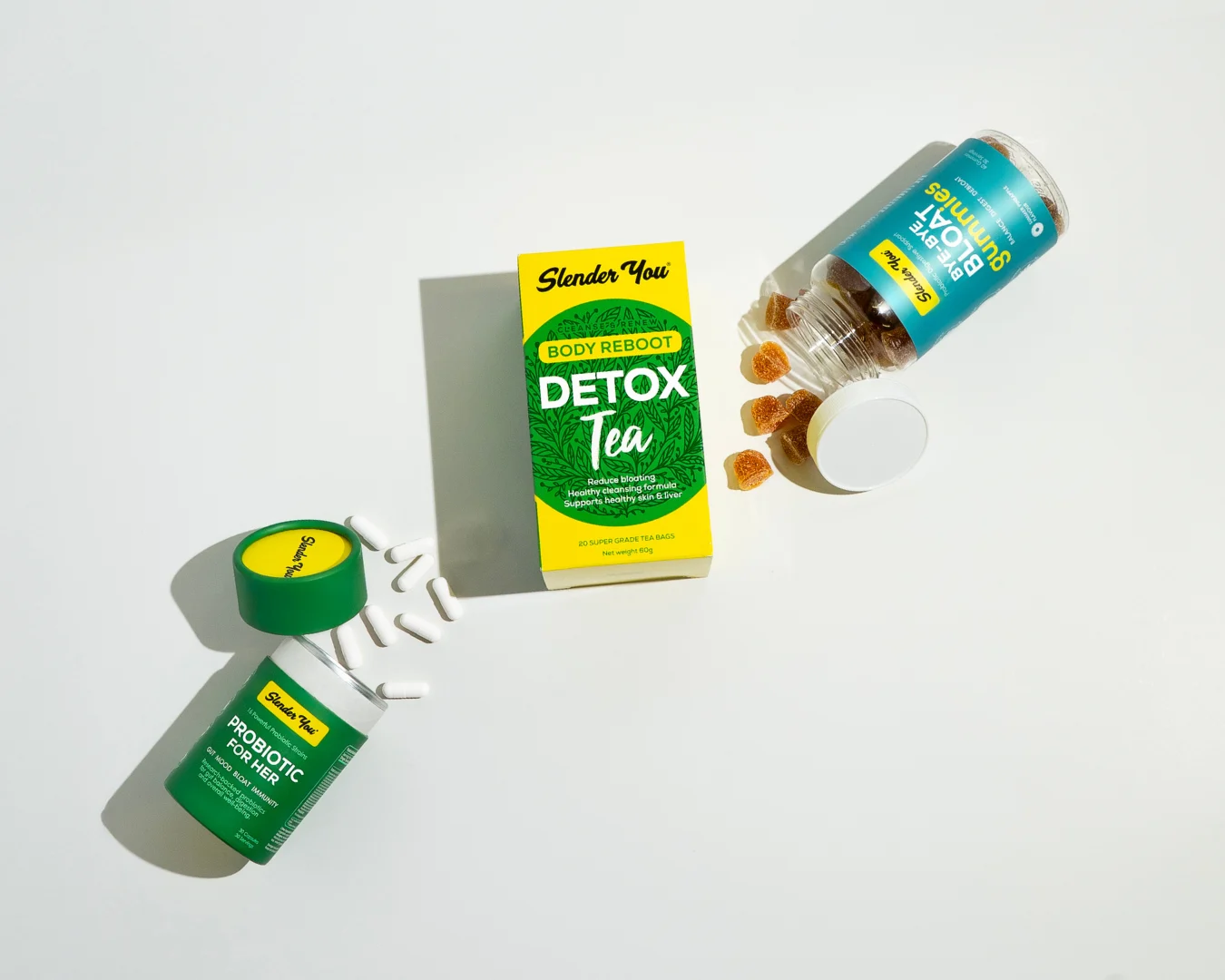• Bye Bye Bloat Gummies: Take 1–2 gummies before breakfast (optional: again after supper)